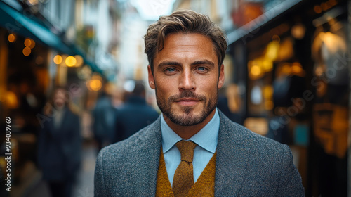 Confident Businessman in Vibrant Urban Office Setting, Focused Professional in Busy City Street, Office Environment, Business Career Concepts
