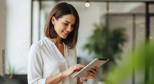 Confident Businesswoman Using Tablet in Modern Office Setting Enhancing Productivity and Connectivity for Efficient Workflow Management and Corporate Communication