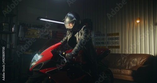 Confident Rider Walks Toward Red Sport Bike, Carefully Adjusts and Buckles Helmet, Pulls Down Visor, Sits on Motorcycle, Ready Start Engine and Head Out With Focus and Determination. Slow Motion.
