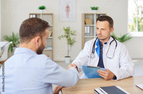 Confident young male doctor therapist in white uniform shaking hands with a man patient sitting at the desk in office after medical examination in clinic. Medicine and health care concept.