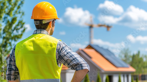 construction engineer observes job site, wearing safety helmet and reflective vest. scene captures sunny day with house featuring solar panels and crane in background, reflecting modern approach to