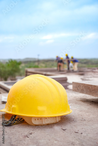 Construction helmet posed with background of workers showing leadership and risk