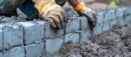 Construction worker laying pavers, outdoor work, close-up