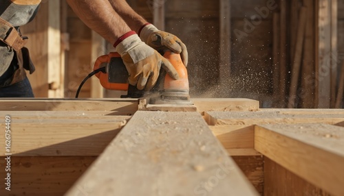 Construction worker sands wooden beams at building site using power tool. Close-up of hands with gloves operating sander, creating fine sawdust. Focus on craftsmanship, precision in woodwork