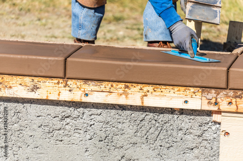 Construction Worker Using Trowel On Wet Cement Forming Coping Around New Pool