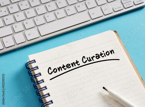 Content curation written on notepad with keyboard and pen on blue background