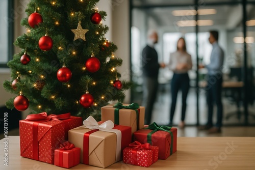 Corporate Christmas celebration with decorated tree and wrapped gifts in foreground, blurred colleagues in suits sharing holiday cheer in office.