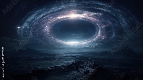Cosmic portal over alien moonscape with swirling galaxy and streaming stars, glowing wormhole energy in dramatic contrast