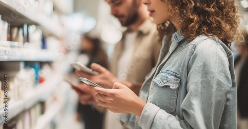 Couple browsing online in a store aisle, comparing items with smartphones, focused on finding the best deals while shopping together.