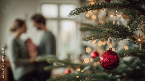 Couple Exchanging Gifts by Christmas Tree, Celebrating Holiday Season in Cozy Home Environment