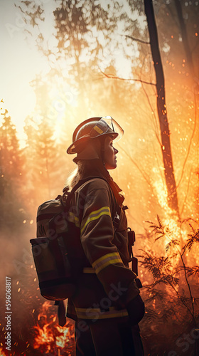 Courageous Female Firefighter Battling Forest Blaze, profile firefighter with fire equipment, cinematic background, AI