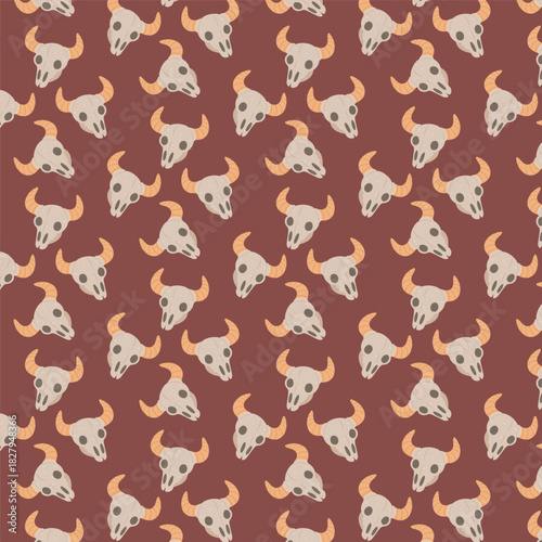 Cowboy skull pattern, rustic western horns seamless vector, boho desert skull design, swatch available in swatches panel