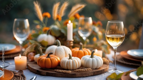 Cozy autumn table setup for family dinner or romantic fall wedding outdoors featuring small pumpkins and candles. White wine. Elegant beautiful arrangement.