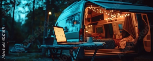 Cozy Campervan Workspace Under the Stars with Fairy Lights and Laptop
