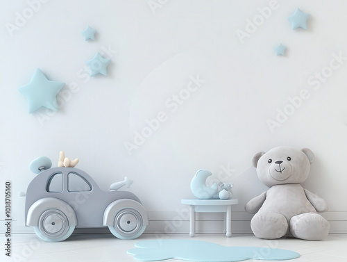 cozy childrens room featuring soft teddy bear, playful toy car, and decorative stars on wall. soothing color palette creates calm and inviting atmosphere