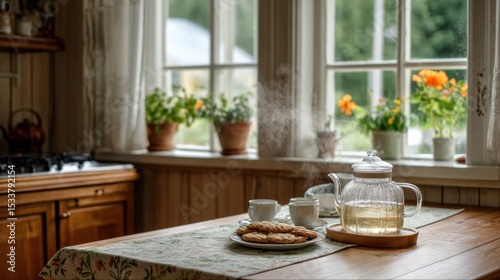 cozy kitchen with kettle and tea on wooden table, window visible