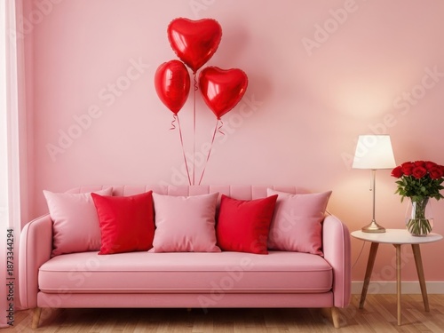Cozy living room with heart-shaped balloons and roses isolated on white background