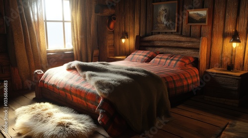 Cozy rustic bedroom with wooden decor and warm lighting