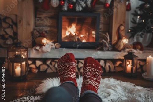 Cozy, warm feet in knitted red socks by the glowing fireplace. Point of view. Charming winter ambiance. Closeup of legs in knit socks near fire stove in the wooden cabin, in rustic room or farmhouse.