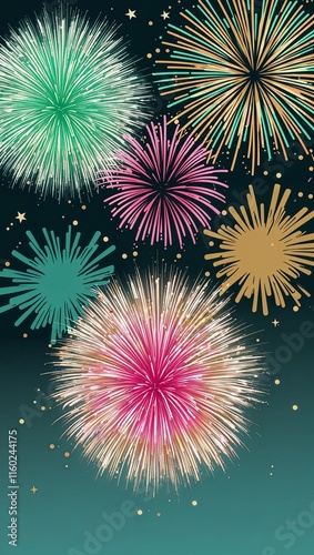 Crafting a multicolor fireworks show with bursts of aqua green pink and gold to inspire joy and adventure
