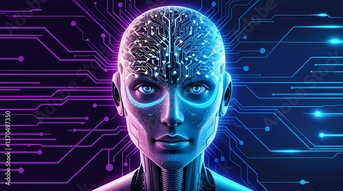 "Creative conceptual vector of artificial intelligence, featuring a robotic human face composed of interconnected neural networks, futuristic circuits, and glowing data streams.