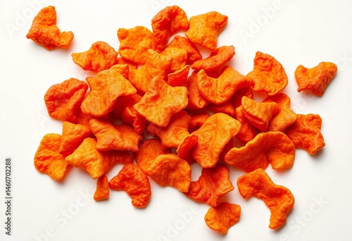 Crispy spicy potato chips scattered on white background, showcasing texture and vibrant red hue, advertising, chili
