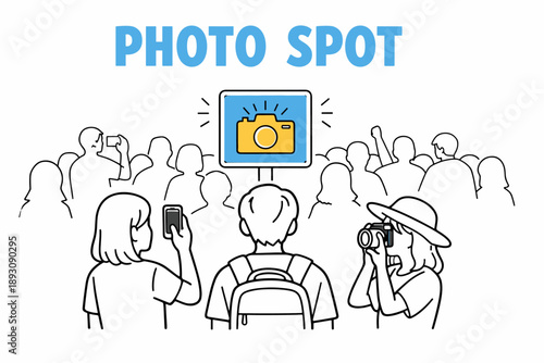 Crowd with phones and cameras at photo spot sign