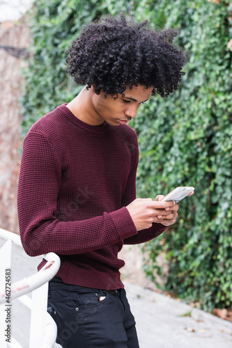 Curly hair boy using mobile phone while standing by railing