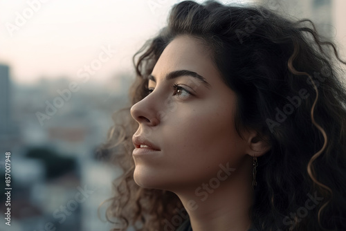 Curly-haired woman in profile view. Outdoor portrait with blurred urban background. Contemplation and serenity concept
