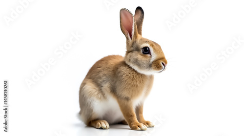Cute brown rabbit sitting on a white surface looking inquisitively to the side during daylight hours