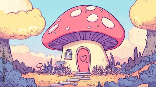 Cute mushroom house in whimsical forest scene