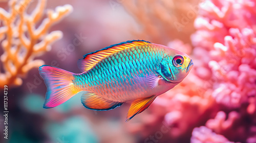 Cute puppy swimming with colorful coral fish in an underwater paradise vibrant marine life joyful exploration