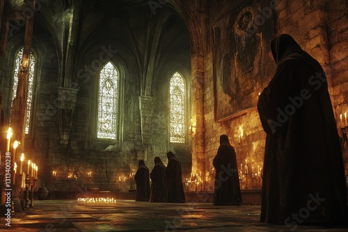Dark Monks in Candlelit Chapel with Stained Glass Windows
