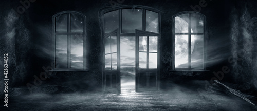Dark scary fantasy room with windows and doors. Big moon, night sky view, rays of moonlight. Old concrete walls and old windows. reflection of light on the floor, neon light. 3D illustration.