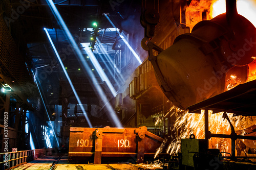 Day view of the oxygen-converter shop. A crane pours cast iron from a ladle into a converter in a kiosk-converter shop.
