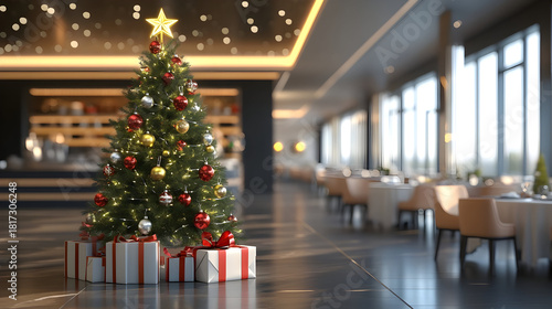 Decorated Christmas tree with gifts inside a restaurant kitchen.