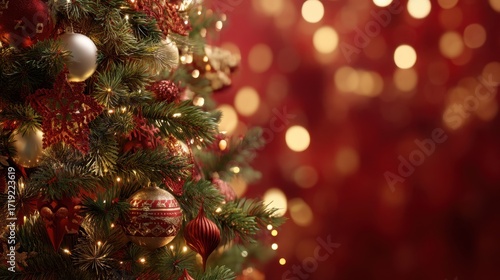 Decorated Christmas tree with shimmering ornaments and lights, rich red background with bokeh effect. Holiday celebration background for greeting card.