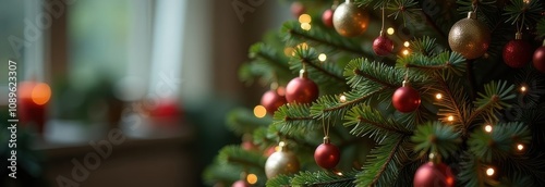 Decorative christmas red balls on a tree with bokeh in the background, shallow depth of field, new year decor, merry christma