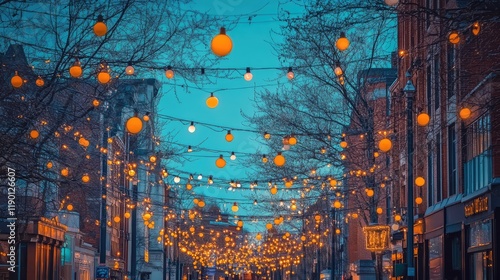 Decorative lights strung between buildings in an outdoor plaza, glowing warmly under a clear evening sky