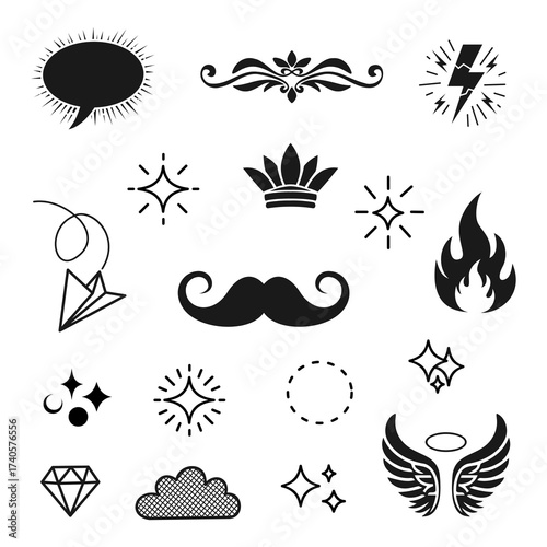 Decorative vintage elements collection with mustache crown wings fire and stars