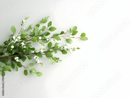 Delicate artificial plant sprigs with small white flowers on a plain white background with copy space.