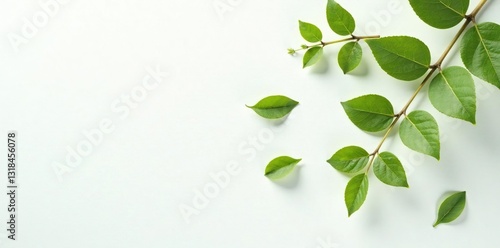Delicate leaf clusters scattered on a white surface, foliage arrangement, simple, serene