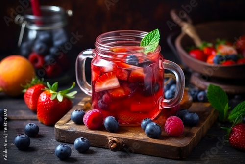delicious and healthy summer cocktail of tropical fruits and berries of red color on a blue background. The concept of healthy drinks with vitamins, proper nutrition.