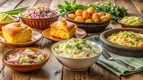 Delicious Coleslaw, Creamy Potato Salad, and Golden Cornbread with Fresh Herbs on a Rustic Wooden Table, Capturing the Essence of Comfort Food and Side Dishes