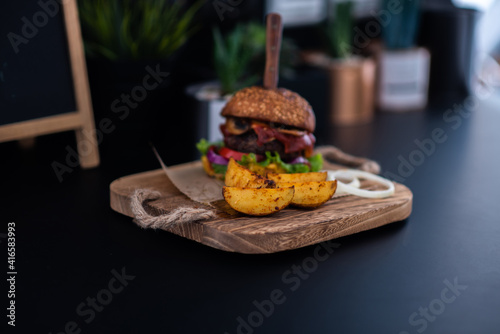 Delicious grilled hamburger and organic vegetables. Homemade beef burgers with grilled beef, mushrooms, lettuce, red onion, tomatoes and sauce on wooden cutting board as well as french fries.