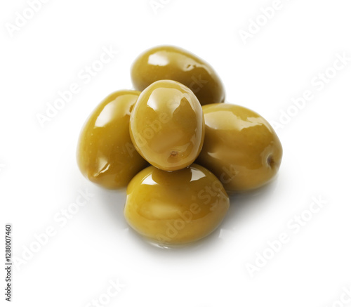 Delicious marinated green olives isolated on white