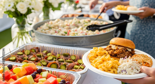 Delicious outdoor buffet with pulled pork sandwich, mac and cheese, fruit salad, and sides