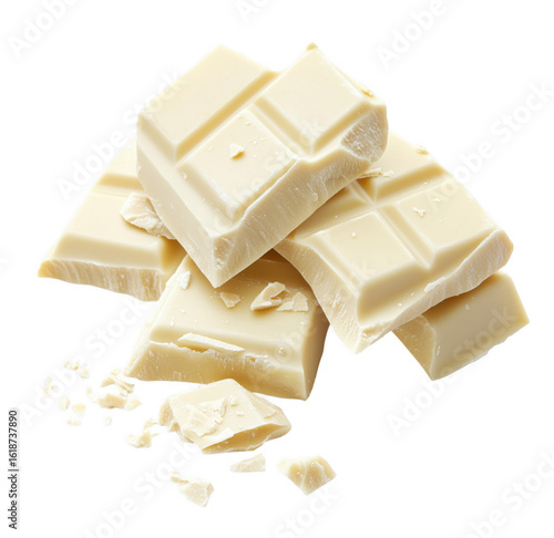 Delicious pieces of white chocolate stacked against a dark white background isolated