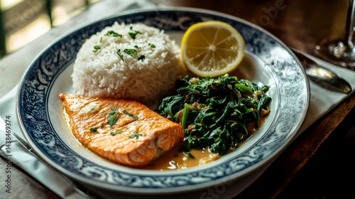 Delicious salmon dish with rice and greens cozy restaurant food photography indoor setting close-up view culinary delight