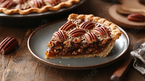 Delicious slice of pecan pie on a ceramic plate, rich and syrupy filling topped with whole pecans